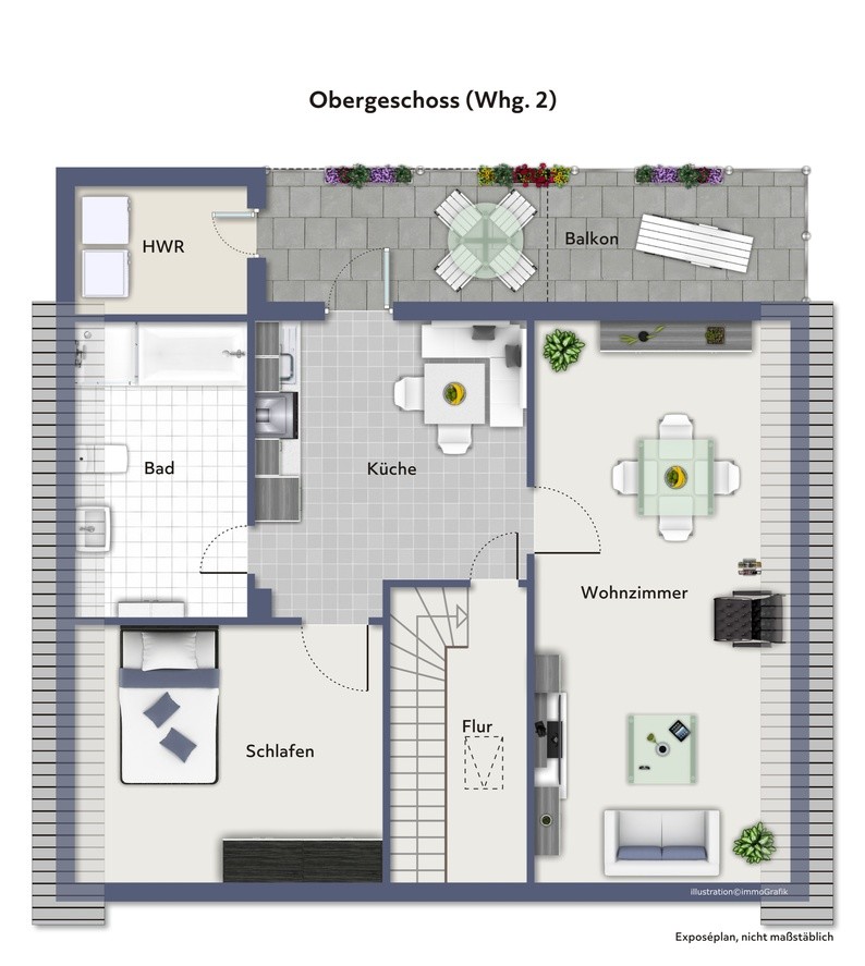 Im Obergeschoss befinden sich ein helles Wohnzimmer mit Zugang zum halb überdachten Balkon, ein Schlafzimmer, eine Küche mit Essbereich sowie ein modernes Badezimmer. Auch hier steht ein separater Hauswirtschaftsraum zur Verfügung.