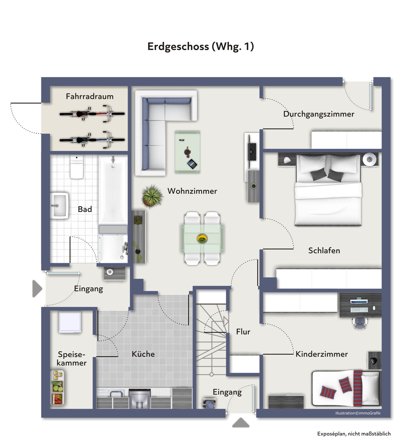 Die Erdgeschosswohnung verfügt über ein großzügiges Wohnzimmer, ein Schlafzimmer, ein Kinderzimmer sowie ein zusätzliches Durchgangszimmer, welches als zusätzlicher Stauraum dient. Eine separate Küche, ein Badezimmer und ein Hauswirtschaftsraum ergänzen das Raumangebot.