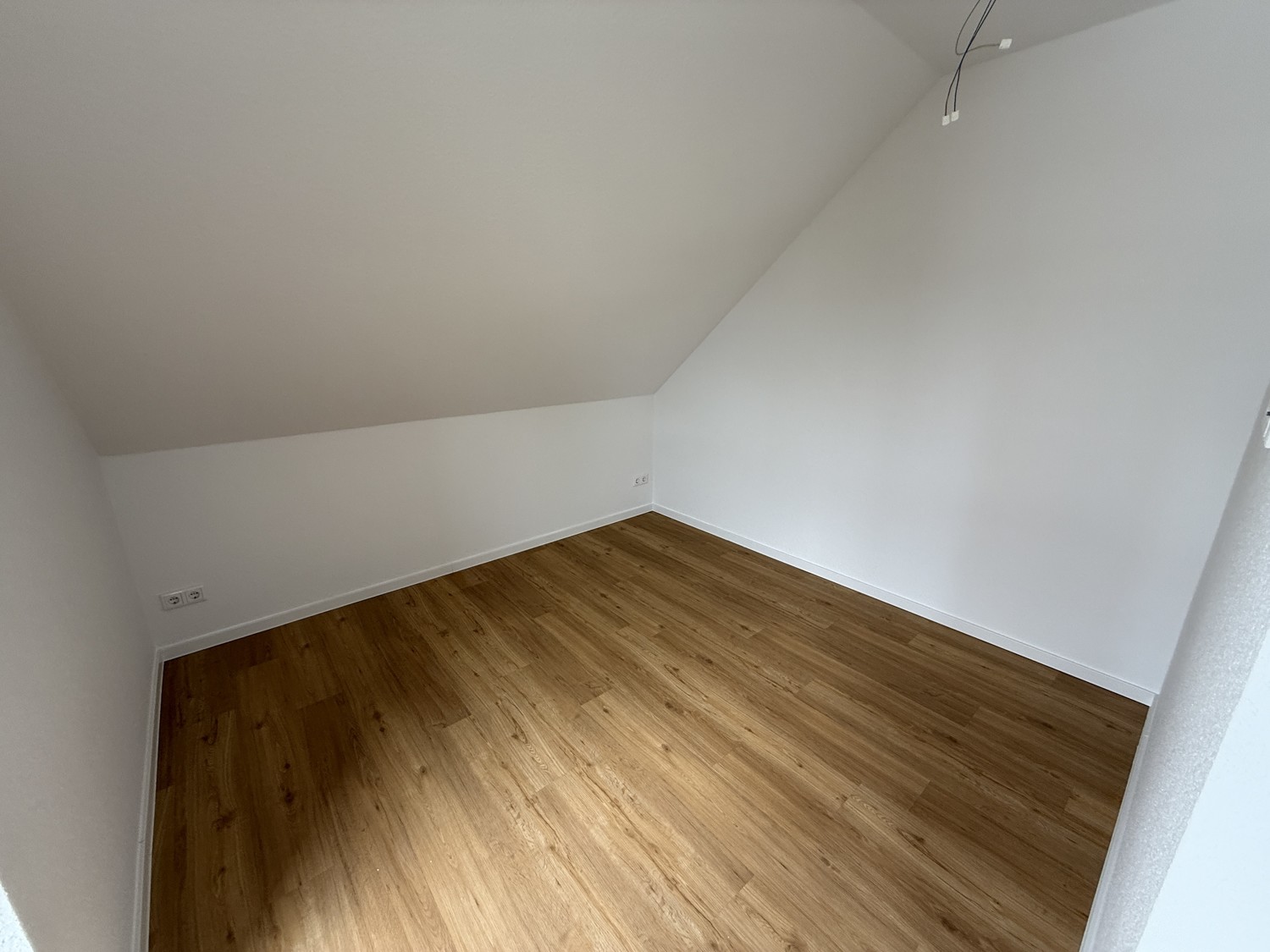 Die Wohnung im Obergeschoss verfügt über ein großzügiges Wohn- und Esszimmer mit Küchenbereich, ein Schlafzimmer, ein Arbeitszimmer, ein Badezimmer, ein Gäste-WC, einen praktischen Abstellraum sowie einen Balkon. Außerdem gehört ein großer Spitzboden zur Wohnung.