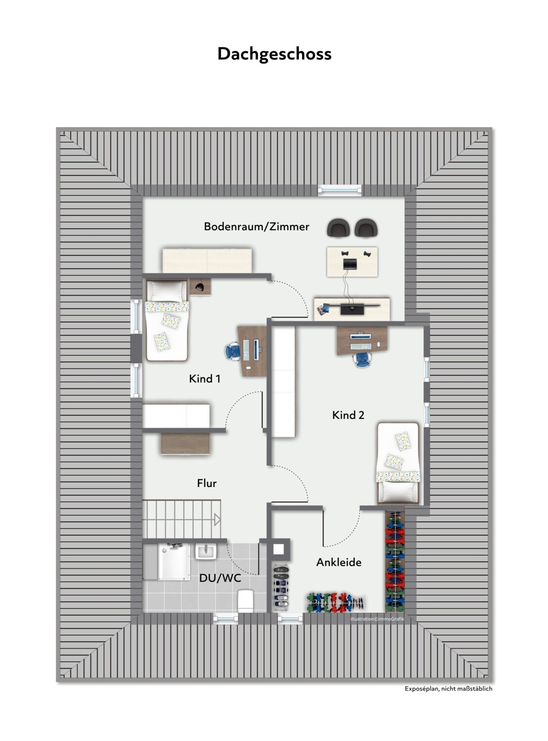 Das Dachgeschoss wurde ausgebaut und beherbergt zwei Kinderzimmer, ein separates WC sowie zwei weitere Zimmer, die flexibel genutzt werden können – beispielsweise als Büro, Gästezimmer oder Hobbyraum. Anschlüsse für eine momentan nicht vorhandene Küche liegen bereits in einem der Zimmer.