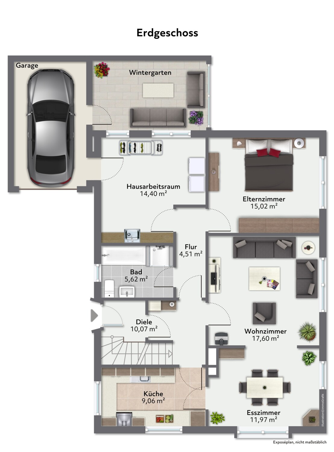 Im Erdgeschoss befinden sich eine funktionale Küche mit Schiebetür zum Esszimmer, ein Badezimmer, ein praktischer Hauswirtschaftsraum mit viel Platz, ein geräumiges Schlafzimmer, ein gemütliches Wohnzimmer sowie ein separates, durch eine Doppelschiebetür getrenntes, Esszimmer. Alle wichtigen Wohnbereiche sind somit bequem auf einer Ebene untergebracht und bieten viel Komfort für den Alltag. Ein Sommergarten, der zusätzlichen Wohnraum schafft und einen Blick in den Garten ermöglicht ist ebenfalls vorhanden.