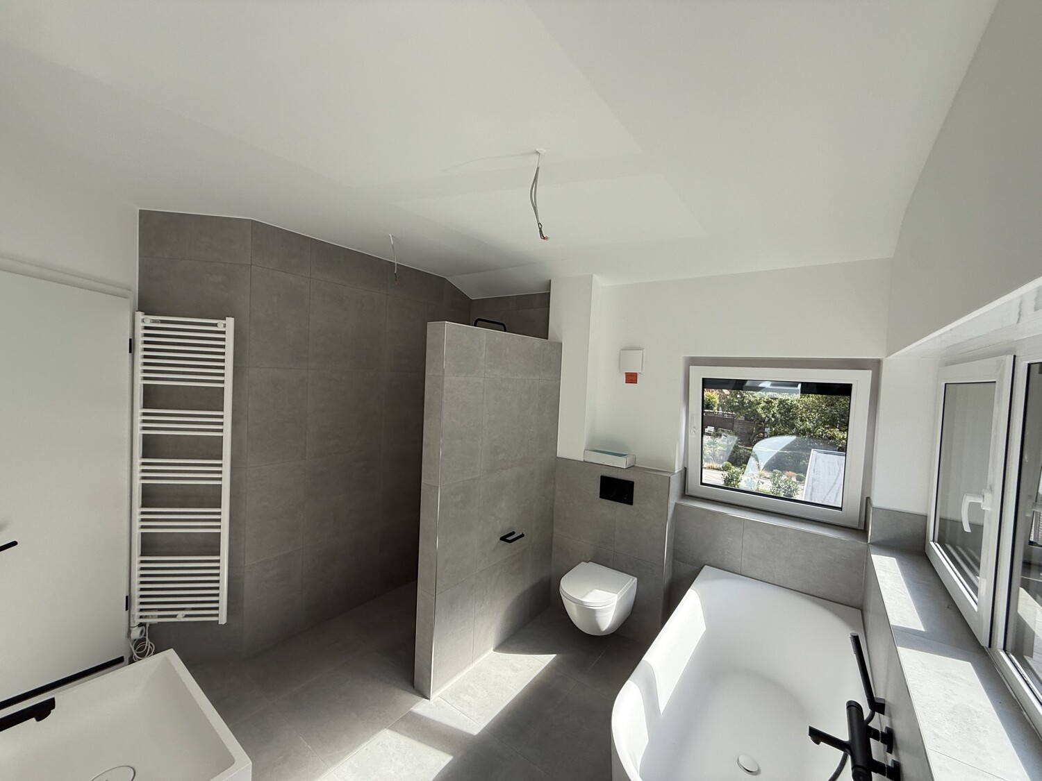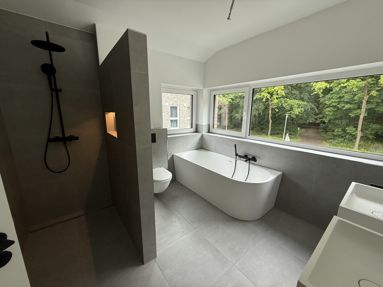 – Modernes Badezimmer mit matt weißer und schwarzer Ausstattung