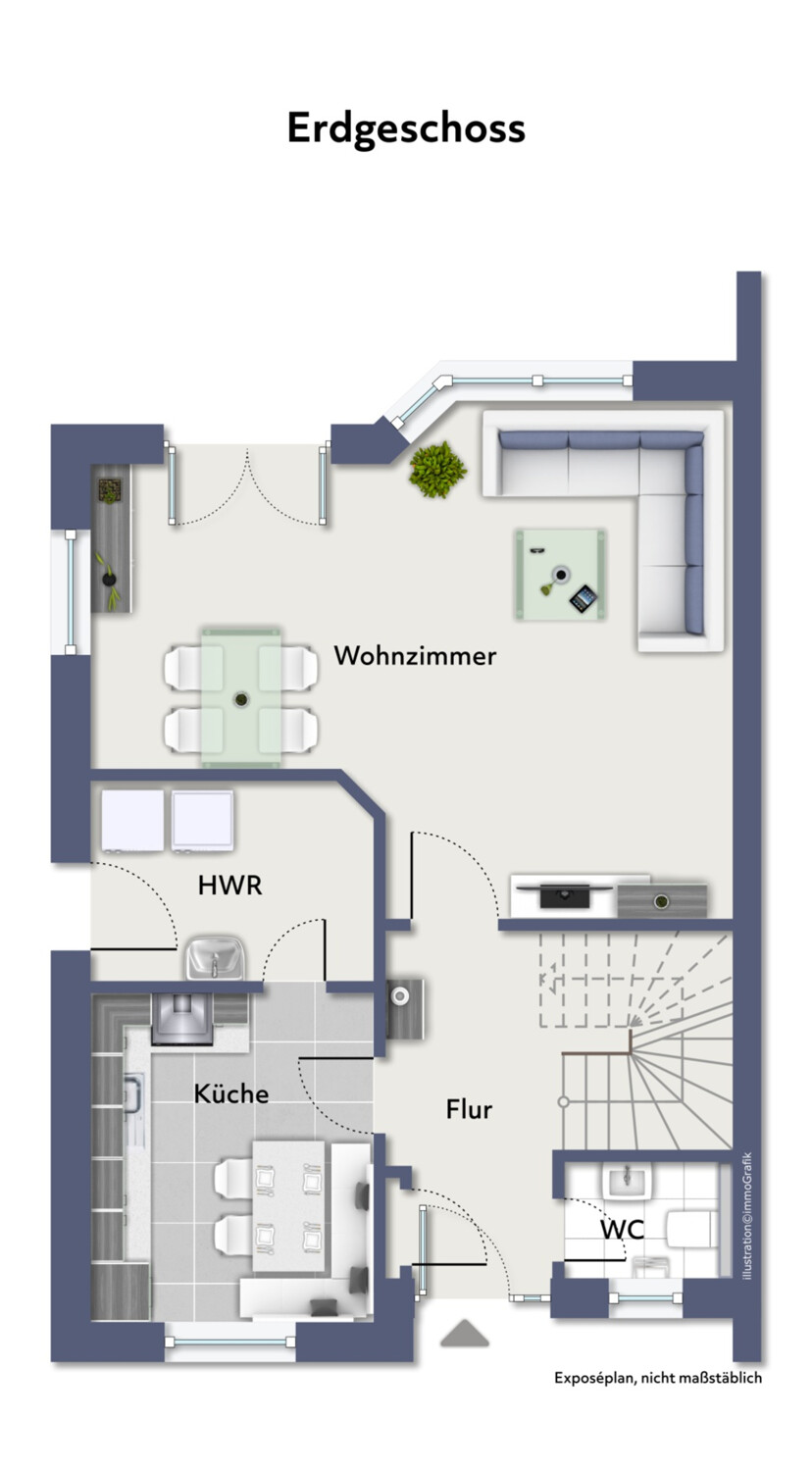 Herzstück des Hauses ist die schöne Wohnküche, die als zentraler Treffpunkt im Alltag dient und Platz zum Kochen, Essen und Zusammensein bietet. Ergänzt wird das Raumangebot durch ein Badezimmer sowie ein separates Gäste-WC. Praktisch im täglichen Gebrauch ist zudem der Hauswirtschaftsraum (HWR), der zusätzliche Abstell- und Arbeitsfläche bereithält.