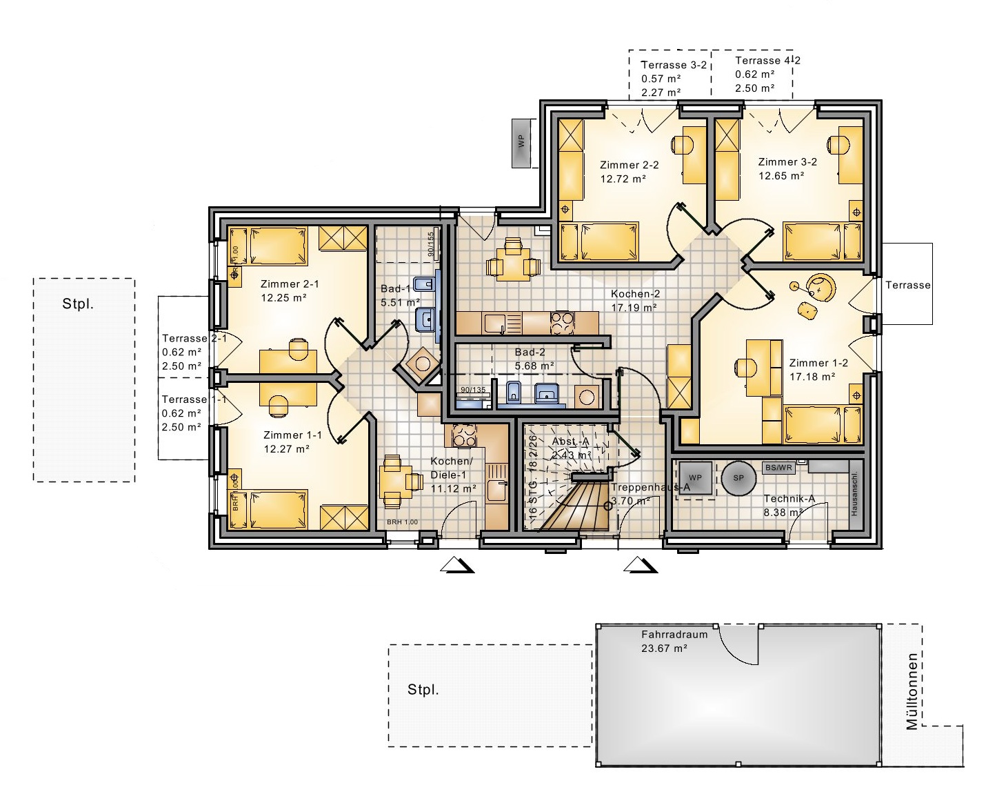 Die Architektur des Hauses umfasst vier gut durchdachte, WG geeignete, Wohnungen, die durch Ihre attraktive Raumaufteilung und Wohnflächen von 44 m² bis 68 m² ideal für Studenten geeignet sind. Jede Einheit ist perfekt konzipiert, um die unterschiedlichen Bedürfnisse der Bewohner zu erfüllen. Zu den Highlights zählen die privaten Außenbereiche: stilvolle Terrassen und Balkone, die perfekte Orte zum Lernen, Entspannen und Genießen schaffen.