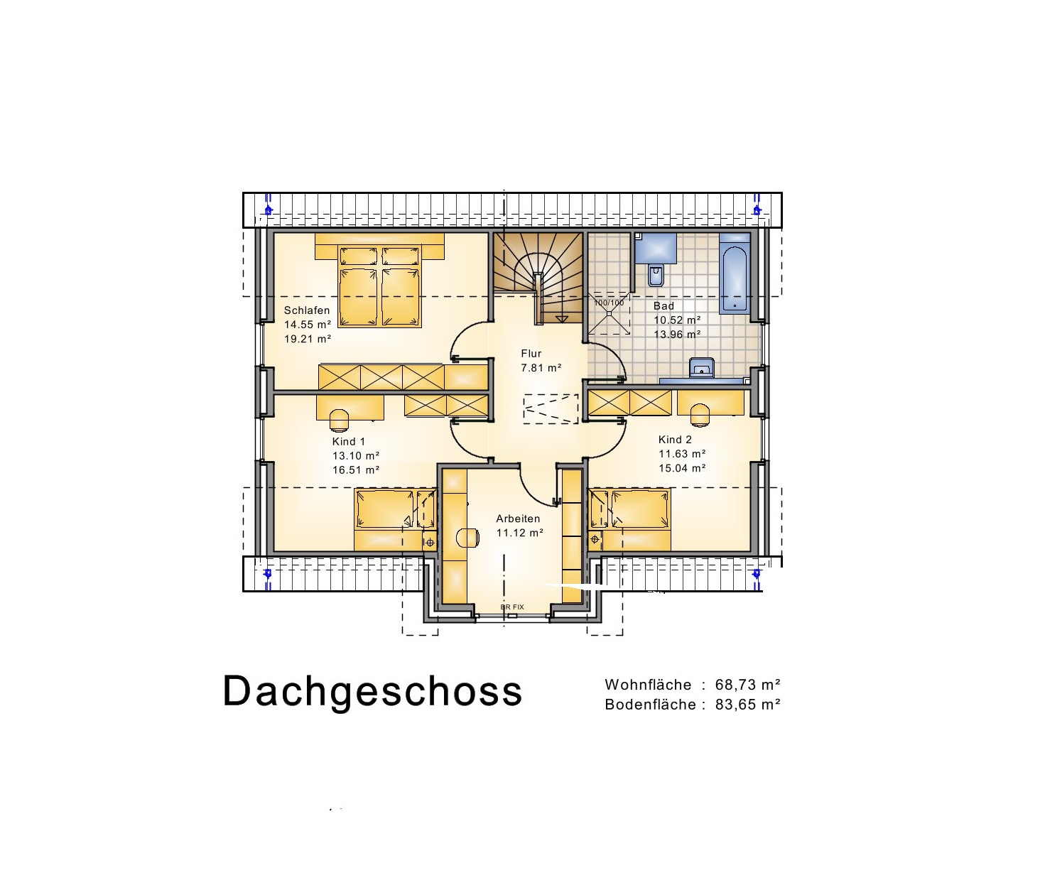 Unser AMR-Satteldach ist seit Jahrzehnten der am häufigsten gebaute Haustyp. Durch jahrelange Erfahrung und stetige Optimierung der Bauabläufe sind unsere Satteldachhäuser Spitzenreiter im Verhältnis von Wohnfläche zu Baukosten.