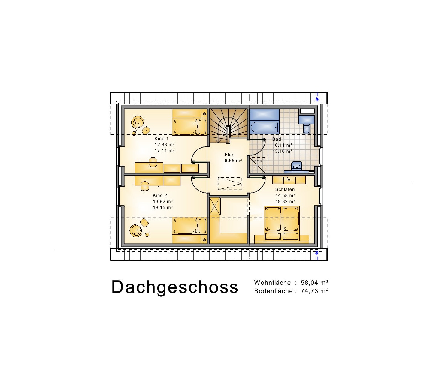 Unser AMR-Satteldach ist seit Jahrzehnten der am häufigsten gebaute Haustyp. Durch jahrelange Erfahrung und stetige Optimierung der Bauabläufe sind unsere Satteldachhäuser Spitzenreiter im Verhältnis von Wohnfläche zu Baukosten.